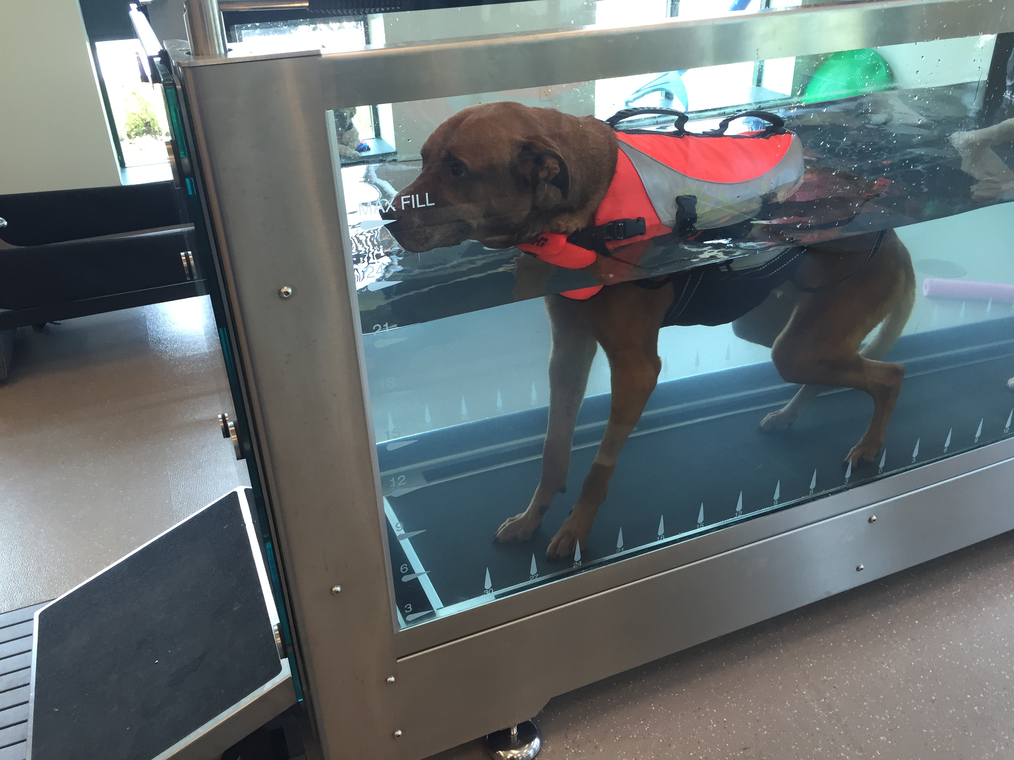 After being warmed up, Cage was placed in either the underwater treadmill or our overhead hoist. This allowed him to stand in a normal position and see the world. It also gave his body feedback (the joints, nerves and muscles all need gravity input to function normally). He would then have electrical stimulation applied to his rear legs to “teach” his muscles how to contract again. After that, he would rest lying down with ice packs on his muscles and joints. A week later, I was able to discontinue tramadol, one of the pain medications he was on.