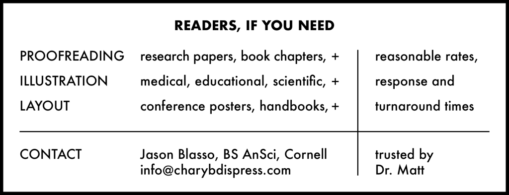 Over the past year, I’ve been working extensively with Dr. Matt on a number of new projects that require editing & proofreading, illustrations & flowcharts, and layout & design. Dr. Matt has graciously given me this guest post space to foreground what I do in the background and to offer the same services to you, dear reader, should you need them. My ad for services can be found in the footer below.
